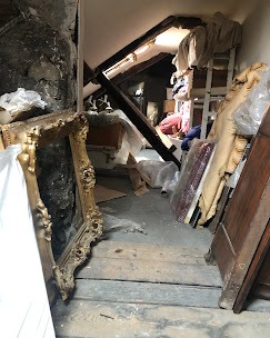 Grenier encombré avant débarras – objets anciens, meubles, cadres et cartons entassés sous les combles